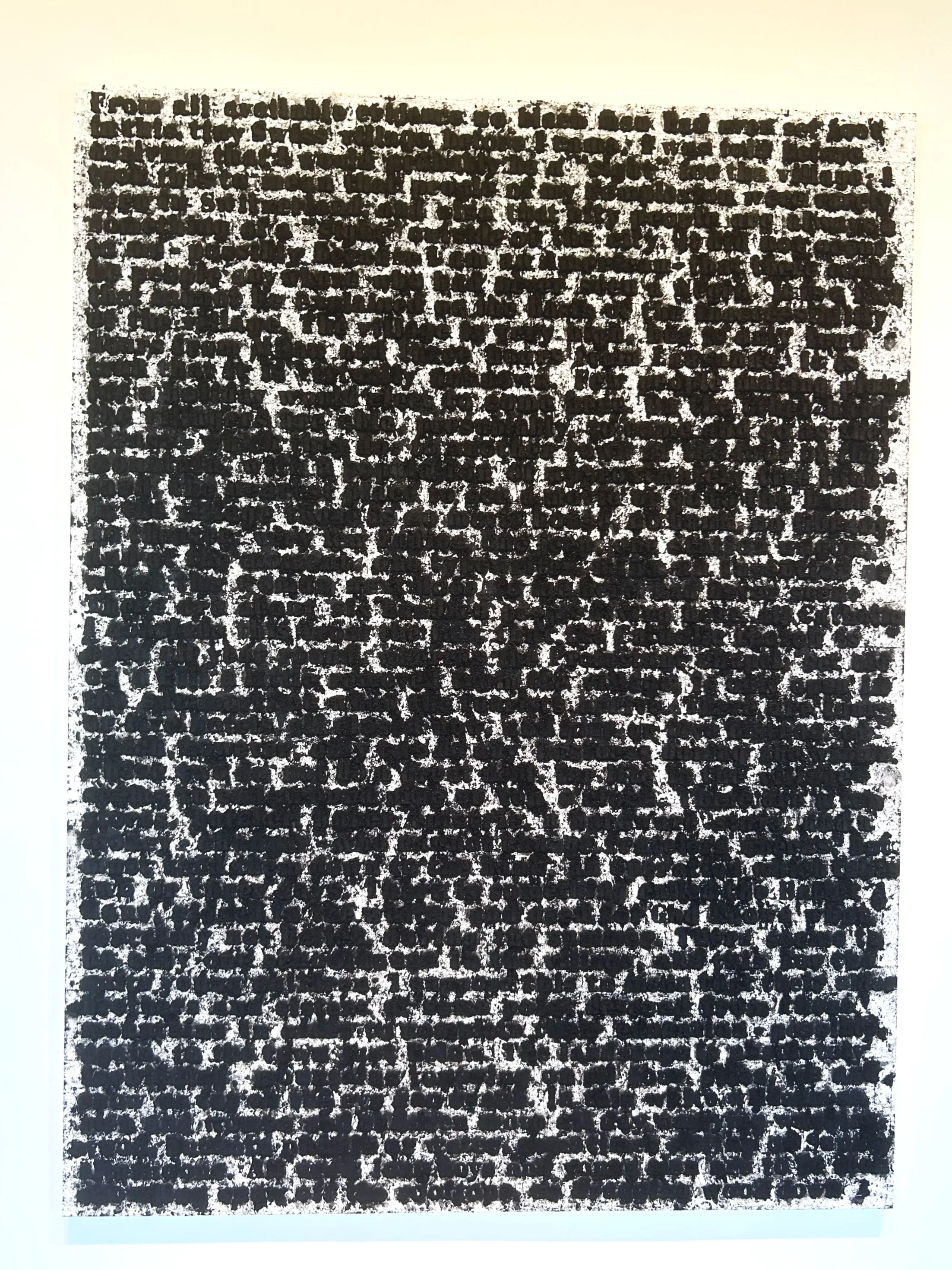 At the Marciano, Glenn Ligon’s #78, made with coal dust, offers a powerful exploration of political differences and ideas of belonging, highlighting his use of this material as both a favorite and a metaphor. This series, inspired by James Baldwin’s 1953 essay “Stranger in the Village,” which he began in 1997, features stencil passages on canvas covered with coal dust and glue until the words nearly disappear. The dark surface makes the text almost unreadable, physically embodying Baldwin’s central question: Who, in the end, is the stranger? This work hits the viewer where they stand.